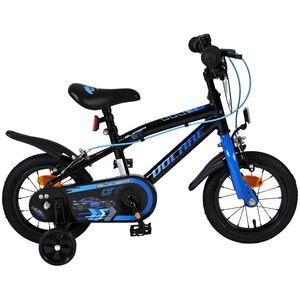 Den seje Volare Super GT 12 tommer børnecykel med blå detaljer er perfekt til nybegyndere! Med to håndbremser, støttehjul, en klokke og en justerbar sadel er denne sikre og stilfulde cykel klar til endeløs cykelsjov.
