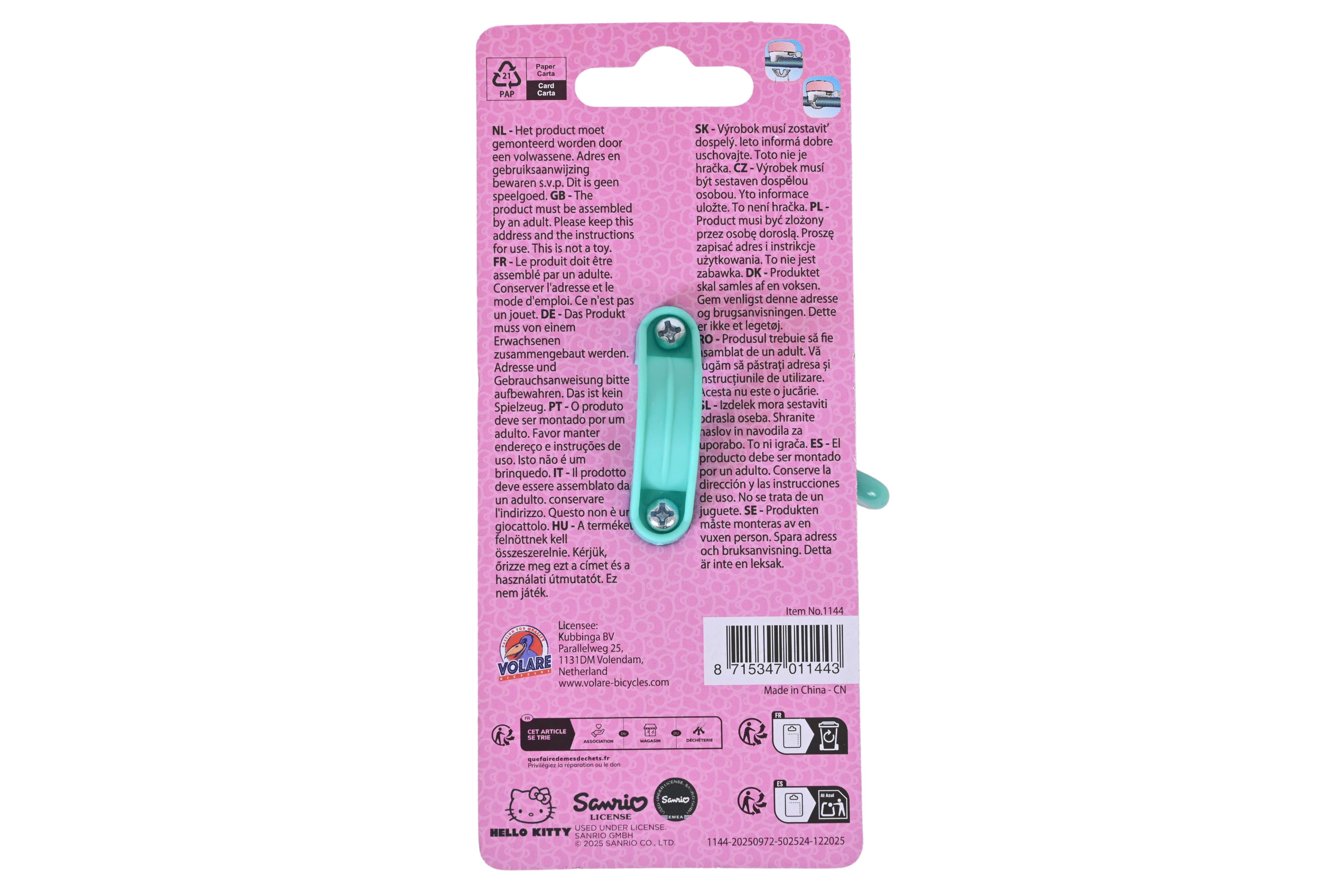 The pink Hello Kitty bell makes every bike just a little bit more fun. With its cheerful Hello Kitty design, it is a real eye-catcher on the handlebars. Of course, it also rings nice and clear, so you are clearly audible on the road. Easy to mount and perfect for any children's bike.