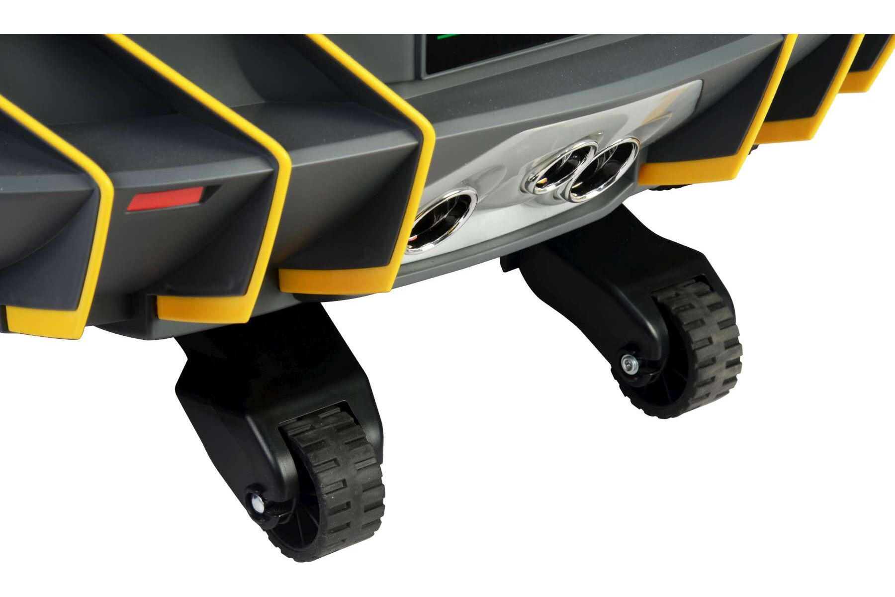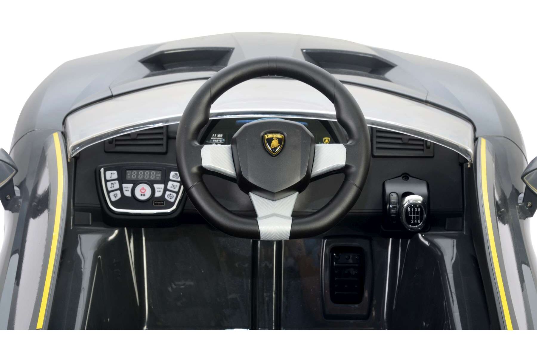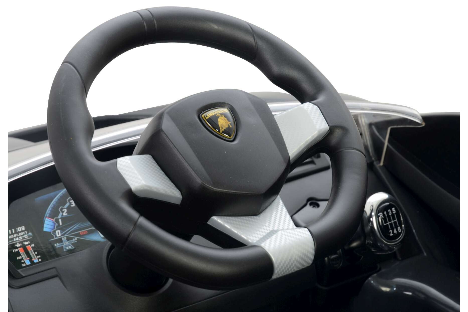 De auto heeft een zeer gedetailleerd dashboard met veel verschillende functies. Zo kan het motorgeluiden produceren, heeft het een toeter, is er een USB en MP3 aansluiting en kunnen de lampen aangezet worden. De Lamborghini heeft 3 versnellingen en kan hiermee vooruit rijden met 2.5, 3.4 en 4.2 kilometer per uur en kan ook achteruit rijden. Daarnaast kan de auto ook bestuurd worden vanaf buiten de auto, namelijk met de afstandsbediening. De afstandsbediening heeft een bereik van 2.4 Ghz waardoor de auto tot op 25 tot 30 meter afstand is te besturen. Hierdoor kunt u uw kind rustig laten wennen aan de auto voordat hij/zij het gaspedaal in kan trappen en zelf kan sturen!