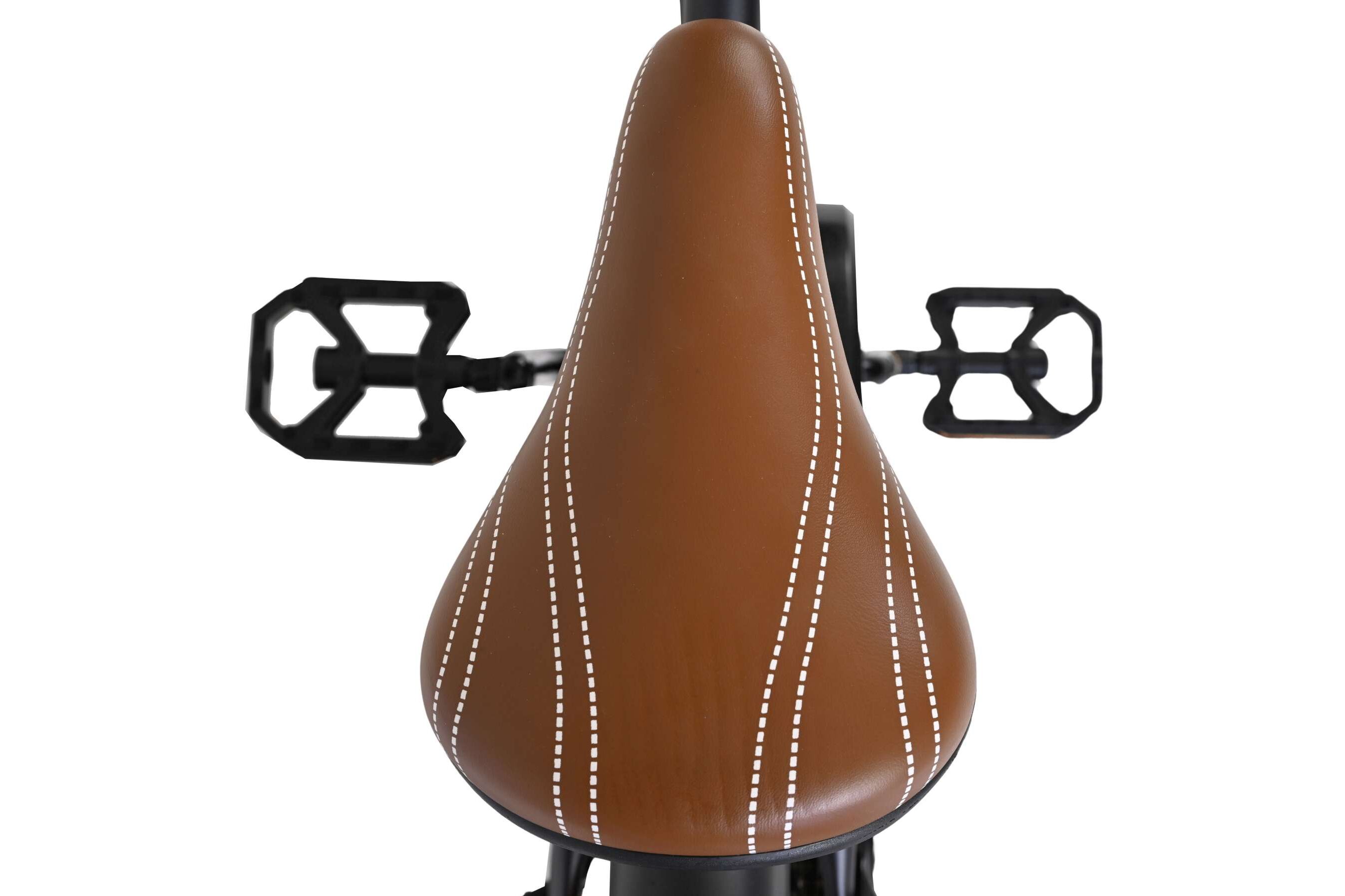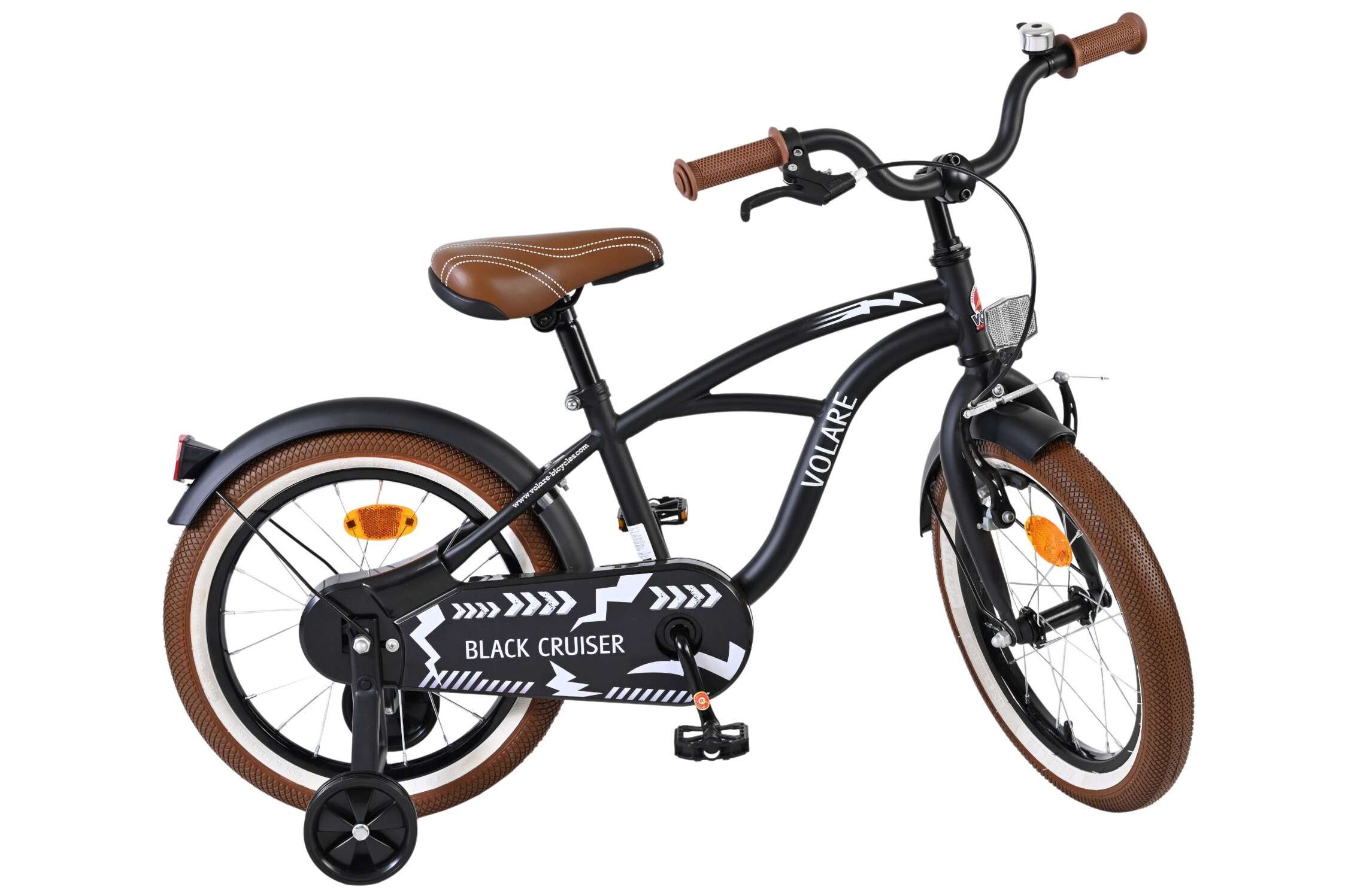De zwarte Volare Black Cruiser 16 inch kinderfiets met bruine accenten is stijlvol en stevig, met zijwieltjes, bel en comfortabel zadel. Dankzij terugtraprem, handrem, gesloten kettingkast en verstelbaar stuur en zadel is deze stoere jongensfiets veilig, comfortabel en groeit hij moeiteloos mee!