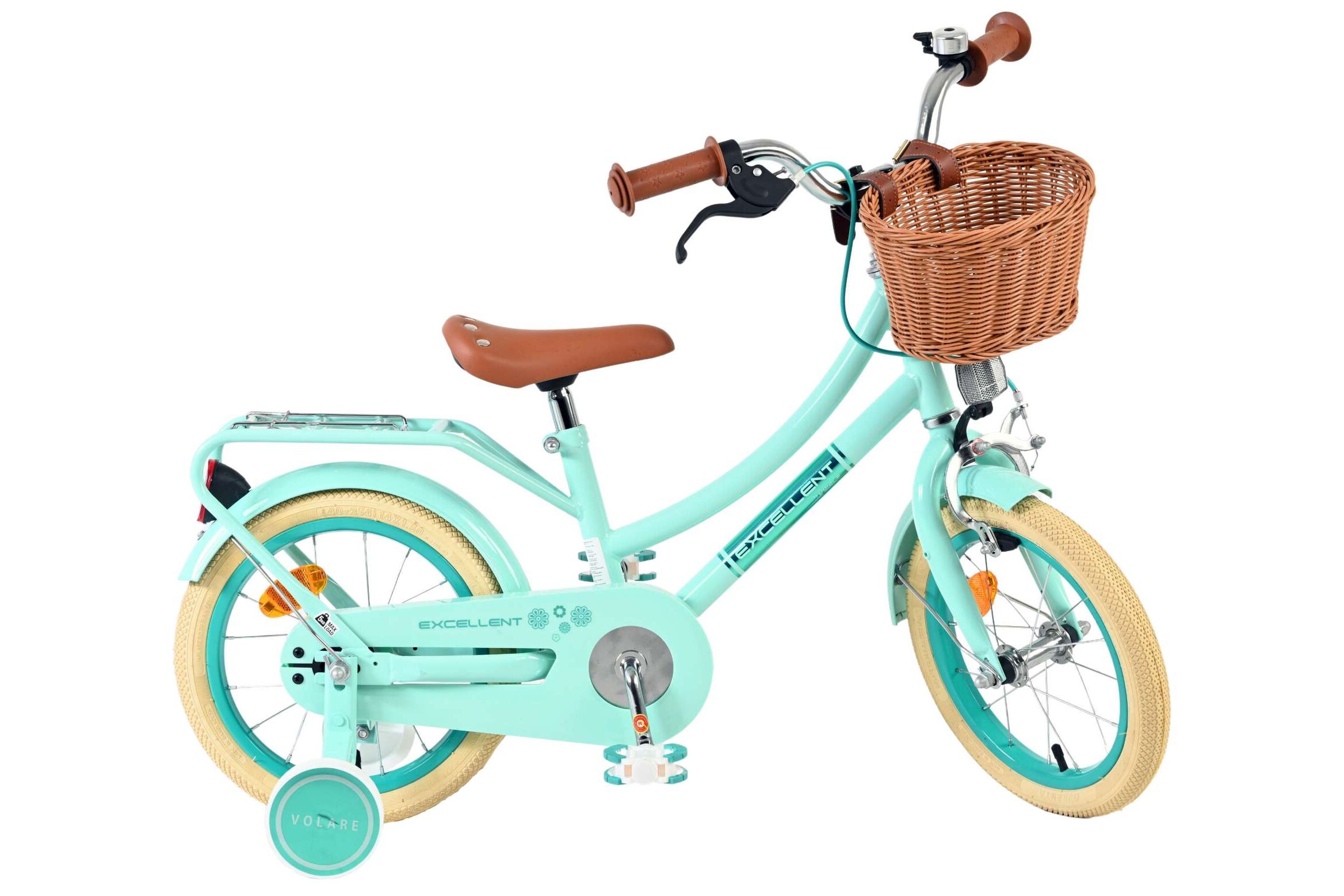 De groene Volare Excellent 14 inch kinderfiets is een veilige en comfortabele eerste fiets, met zijwieltjes, bel, rieten mandje en praktische achterdrager. Dankzij terugtraprem, handrem, gesloten kettingkast en verstelbaar stuur en zadel groeit deze stoere kinderfiets moeiteloos met je kind mee!