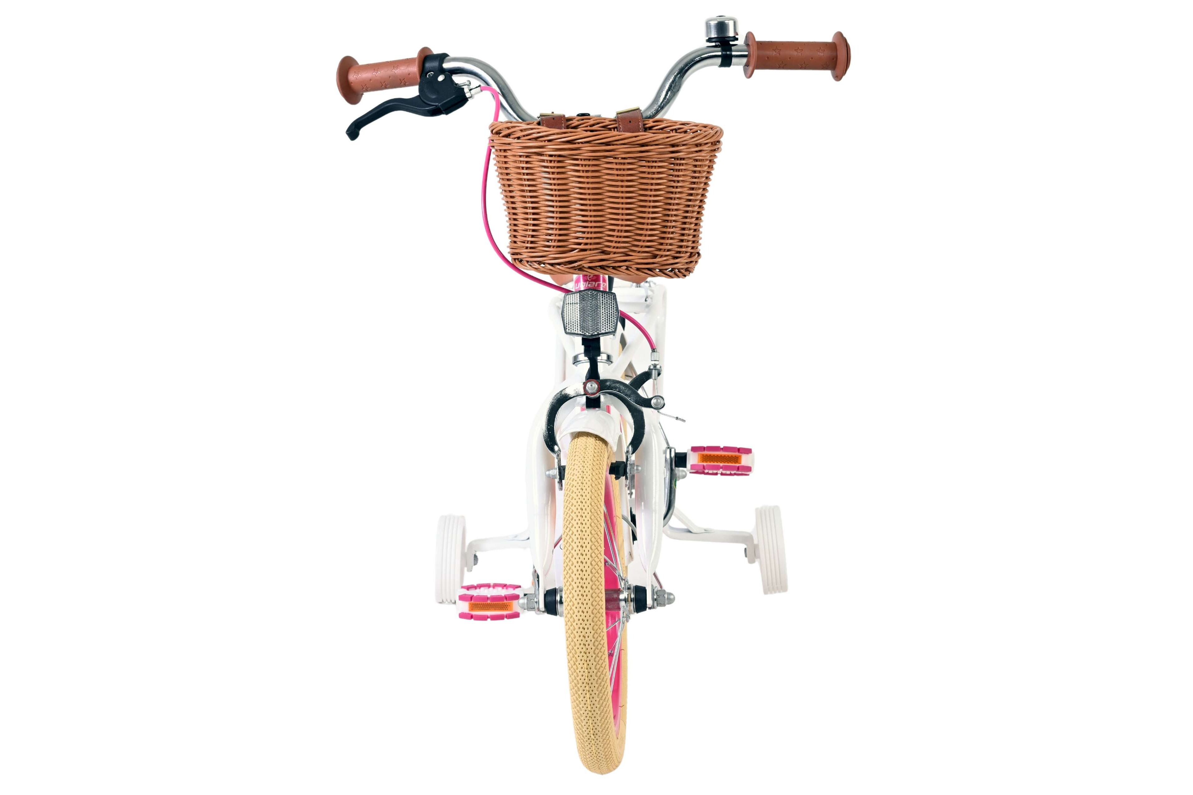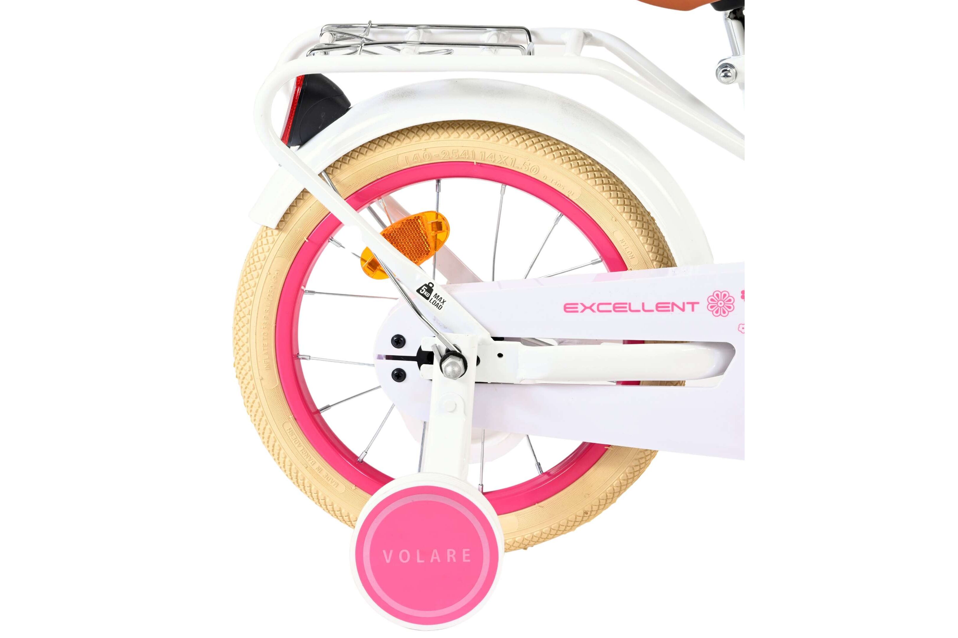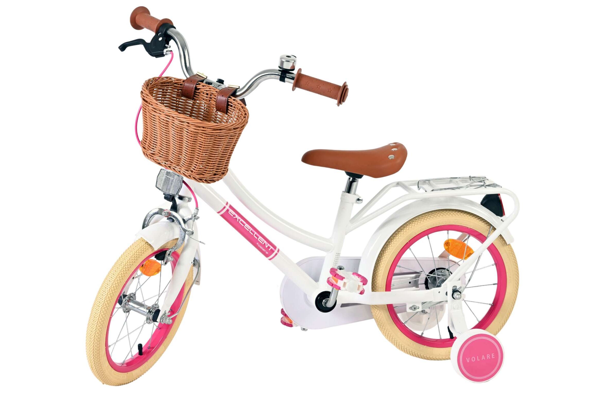 De witte Volare Excellent 14 inch meisjesfiets is een stijlvolle en veilige eerste fiets, met zijwieltjes, bel, rieten mandje en achterdrager. Dankzij terugtraprem, handrem, gesloten kettingkast en verstelbaar stuur en zadel groeit deze comfortabele kinderfiets moeiteloos met je kind mee!