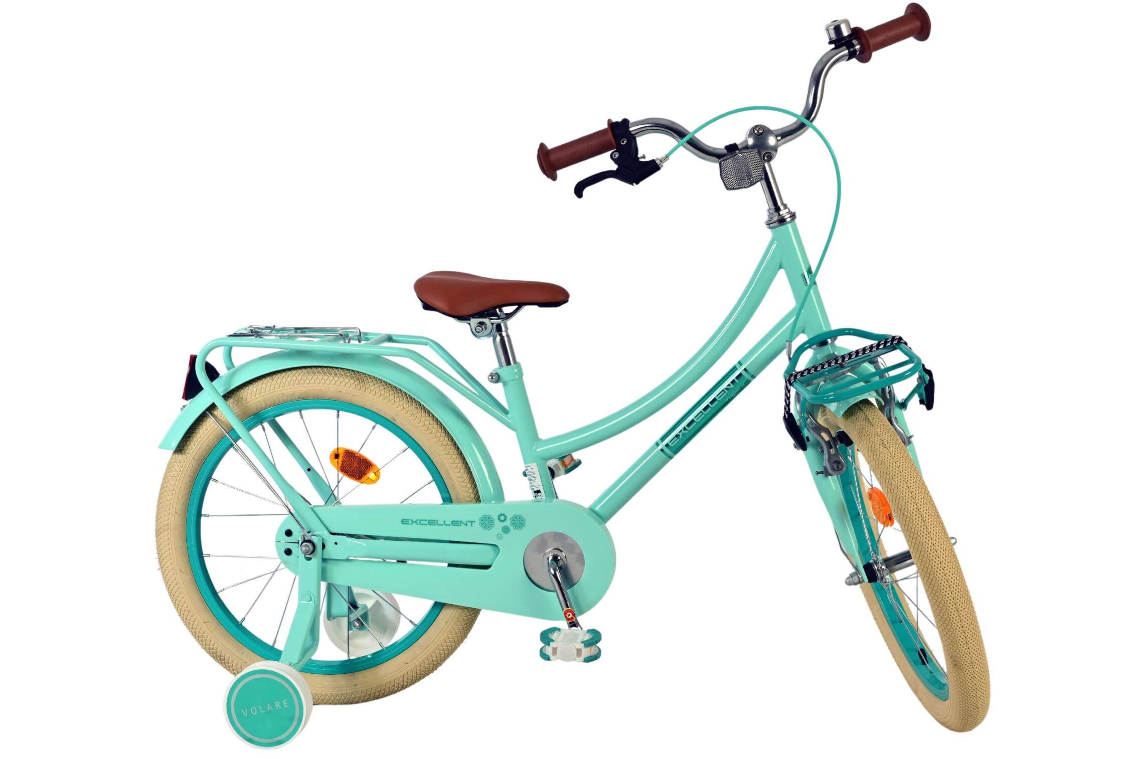 De groene Volare Excellent 18 inch kinderfiets is ideaal voor beginnende fietsers, met zijwieltjes, een bel, reflectoren en een stevige voordrager met snelbinders. Dankzij terugtraprem, handrem en verstelbaar stuur en zadel is deze kinderfiets veilig, comfortabel én klaar om met je kind mee te groeien!